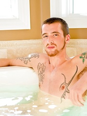 Gay hunk gets too horny and showers in his suit and socks, then pulls his hard cock