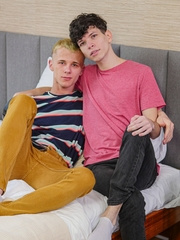 Hot skinny twinks Brayden Michaels and Max McQueen ride each other's dicks on a bed