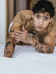 Skinny latino Liam Zuares playing with his uncut dick